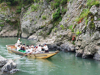 京都屈指の渓谷美で知られている保津峡の渓流を、全行程約16km、約2時間かけて小舟で下ります。岩の間をすり抜けて滑るように進むスリル満点の川下りが堪能できます。